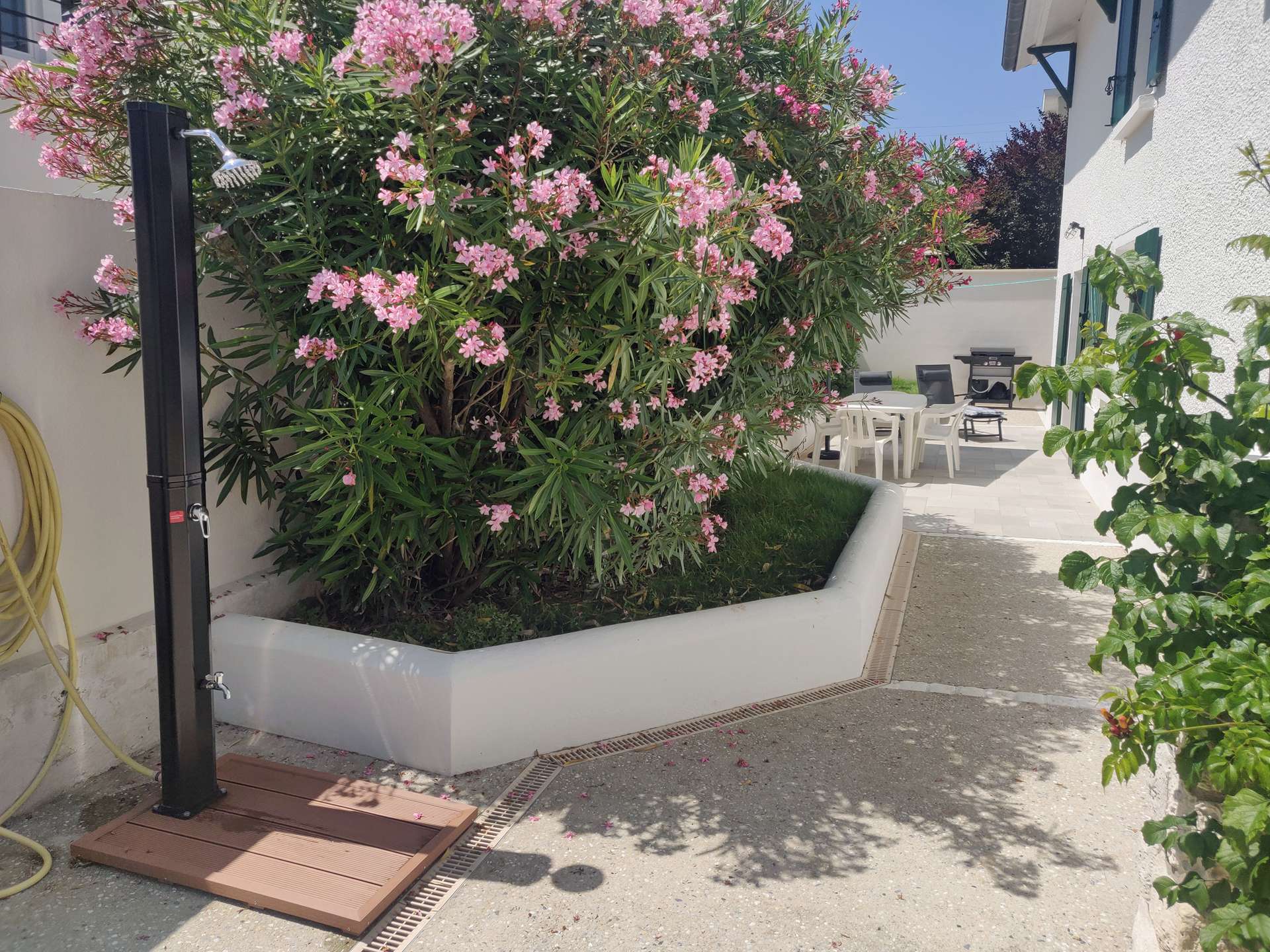 Imaginez vous après une journée de plage, se balader, en regardant le coucher du soleil, diner sur la terrasse, après avoir pris une douche pour enlever le sable à côté du laurier rose.(douche extérieure).